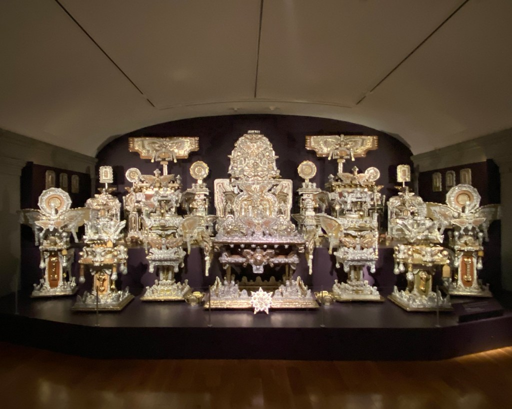 Por último, una obra de James Hampton, The Throne (El trono), un bocatto di cardinale para despedirme de tan hipnótica galería. La verdad es que la National Portrait Gallery hizo que me olvidara de todo y que prestara atención a lo puramente desconocido o anónimo, al menos desde el punto de vista de la idea de arte que transmiten el mercado, muchas publicaciones, la academia, y lo que a menudo llamamos «el mundo del arte». ¿No podría ser ese uno de los objetivos del arte: llevar nuestra atención a lo que no recibe clamorosa atención, a lo desconocido? ¿No es acaso esa imparable “inmersión” en decenas de narrativas ignotas ajenas a la «grandeza» la mejor manera de seguir afrontando el día? La evocación de narrativas disparatadas y dispares, olvidadas, periféricas, nuevas, o sencillamente carentes de tantas faustas autorías que el marketing, el coleccionismo especulativo o la academia han endiosado hasta elevarlas a dogma, ¿no es en sí misma creativa para los que las contemplamos? Lo mismo ocurre con la evocación de las narrativas fáciles de comprender, pero no por “fáciles” o “menores”, sino porque son anómalas para un sistema que solo quiere comprar nuestra atención, y dominarla… Narrativas y contextos expuestos para mirar de otro modo; para recordar que no solo hay una forma de mirar, de hacer y de construir una calidad para el arte. Quizás, en unas décadas, o tal vez menos, algunas de estas obras pasen a convertirse inexorablemente en cualificadas alegorías del pasado, en reinas del mercado, pero, hasta que llegue ese momento, los visitantes acudimos a disfrutar de sus «latentes cualidades» con doméstica y reconfortante inmediatez.