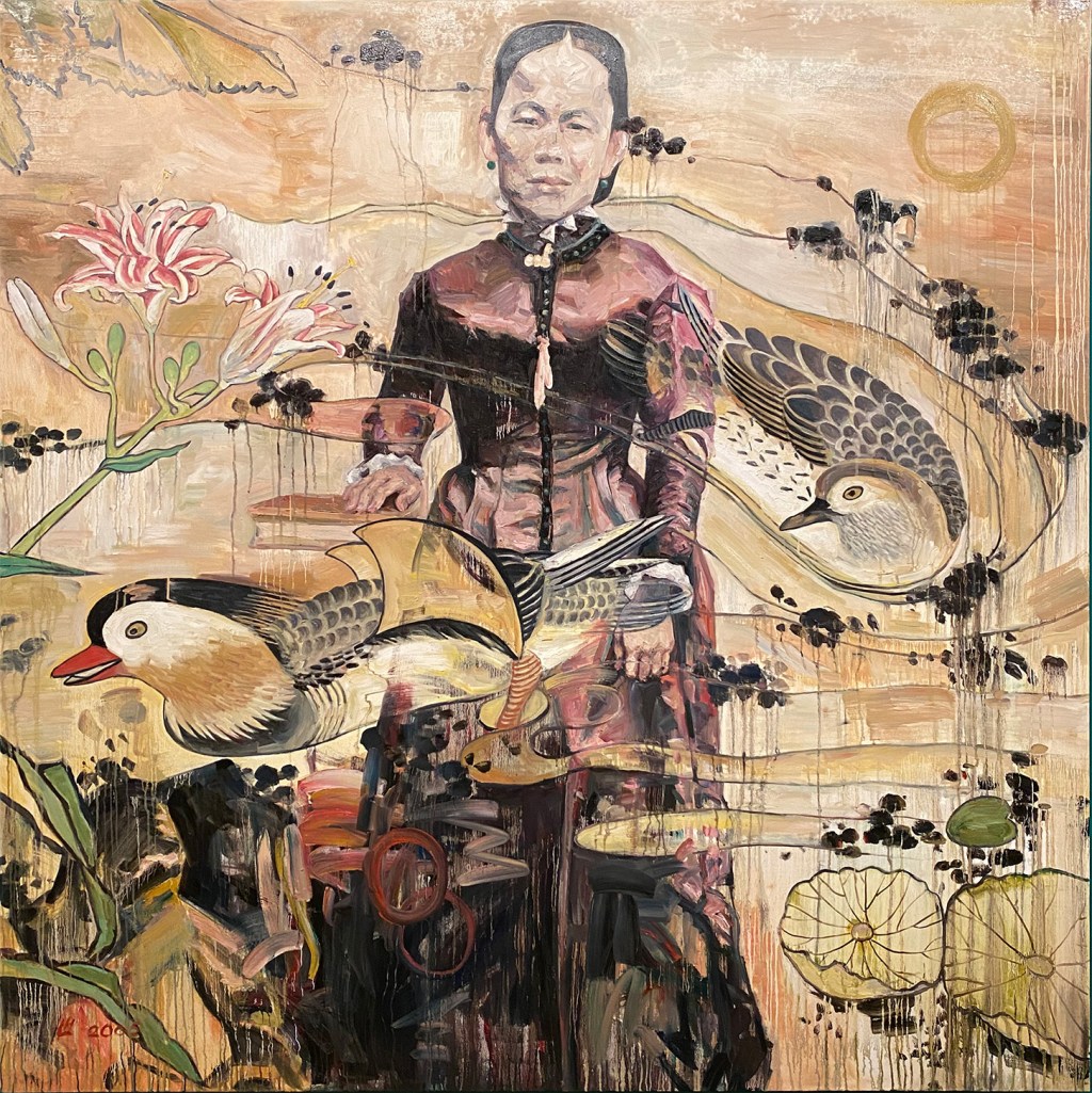 Otras obras me encandilaron antes de entregarme de nuevo al achicharrante estío washingtoniano, y las he escogido para terminar esta nota: Mandarin Duck (Patos mandarines), 2005, de Hung Liu (1948-2021), pintora del realismo-socialista chino antes de emigrar a EEUU, en 1984. Liu retrata a Polly Bemis (1853-1933), una activista que luchó por su independencia en Idaho, donde se casó con un tabernero local para evitar la deportación.
