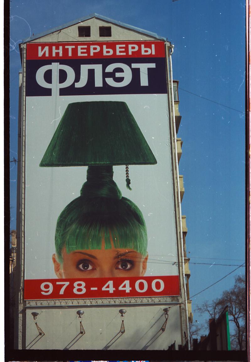 A witty Russian version of Breakfast at Tiffany’s sophistication. Audrey Hepburn’s style was worshipped in Russia, specially her embodiment of luxury-prone and amoral Holly Golightly, the main character in the famous novel by Truman Capote. One can see how this ad masters the art of evocating literature or non- Russian cinema together with a consumption urge. This picture was taken in 2003 in central Moscow, in an area close to Golovin Pereulok.