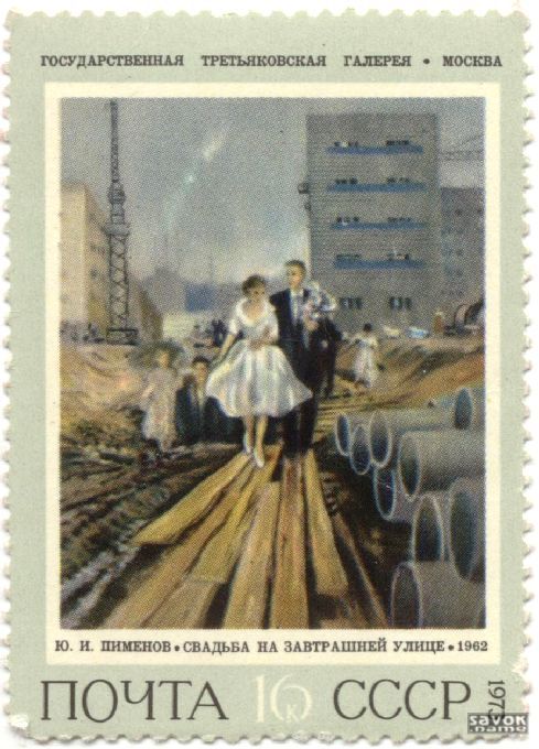 A stamp reproducing Wedding on a Tomorrow Street, by Yuri Pimenov, kept at the Tretiakov State Gallery in Moscow